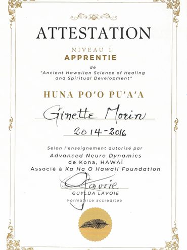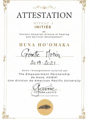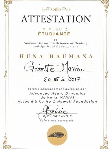Lors d'une rencontre avec une personne forte en connection énergétique, elle m'a dit que j'étais une "passeuse d'âme"; j'en ai ensuite parlé à une praticienne Huna que je voyais pour moi-même, et elle m'a informée que le Huna serait approprié pour moi. J'ai donc commencé une formation; comme c'est une ancienne sagesse de guérison hawaïenne qui utilise les fréquences de Lumière et d'Amour purs, j'ai réalisé, au fur et à mesure de mes formations, que ce serait ma façon d'apporter du bien-être autour de moi, chose que j'ai toujours voulu faire.